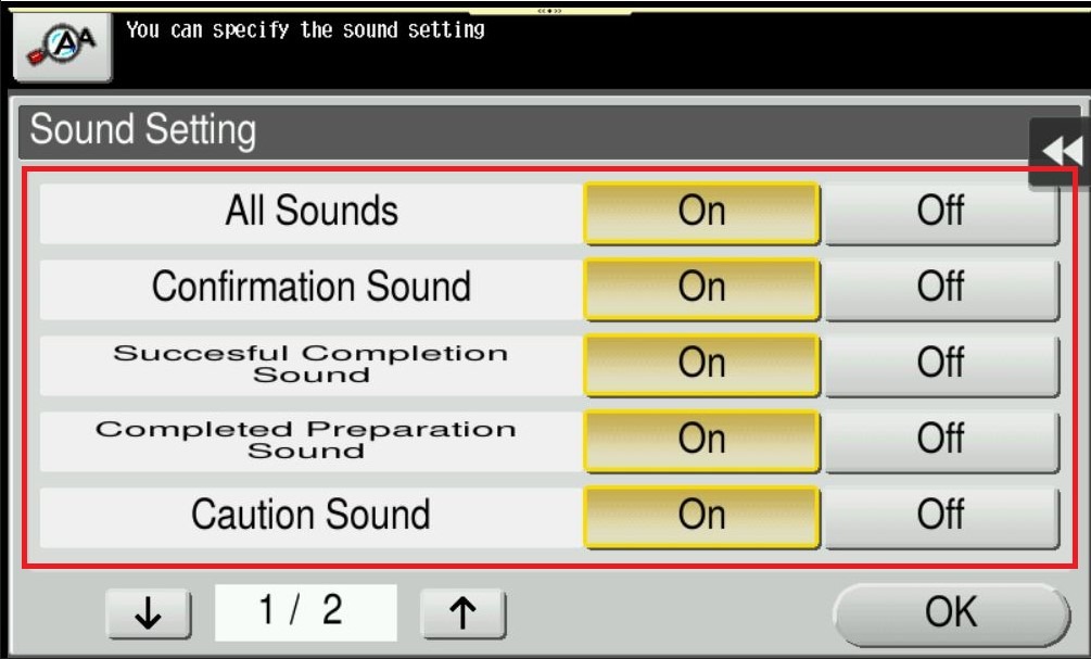 | [Sound Setting] | Select whether to respectively output the [Confirmation Sound], [Successful Completion Sound], [Completed Preparation Sound], [Caution Sound], [Deletion Sound], and [Authentication Sound] (default: [On]). If [All Sounds] is set to [Off], none of these sounds will be output. |