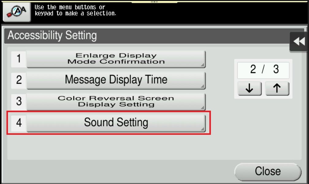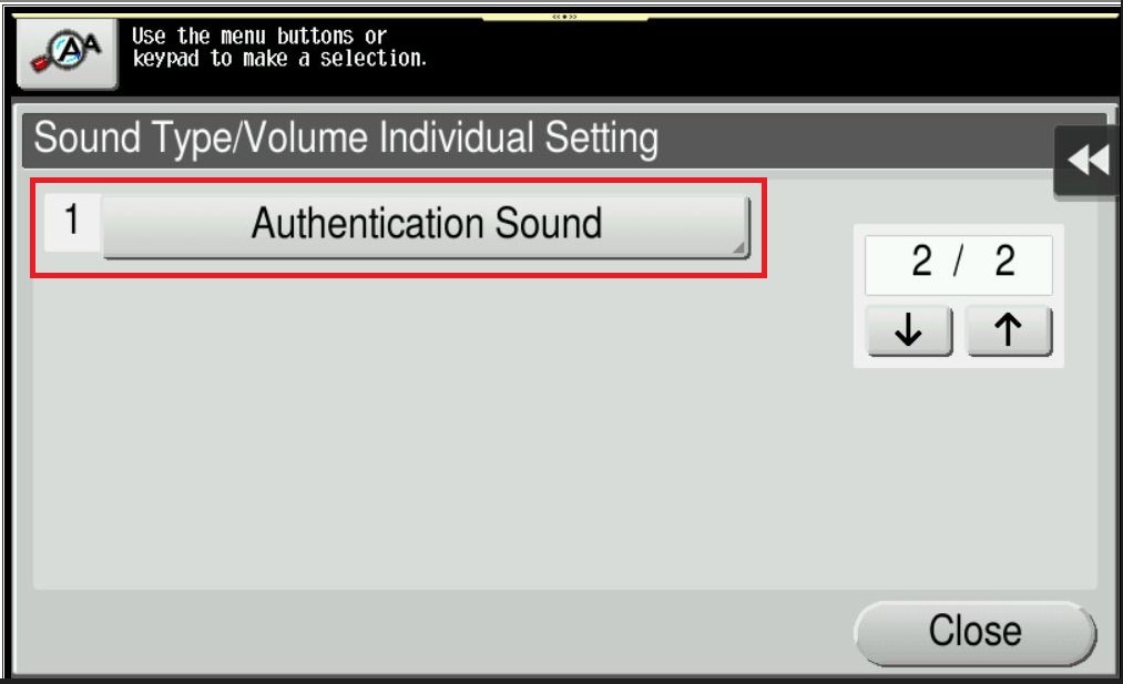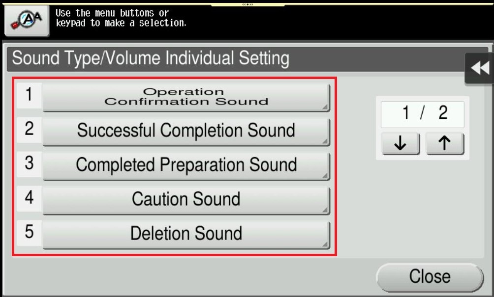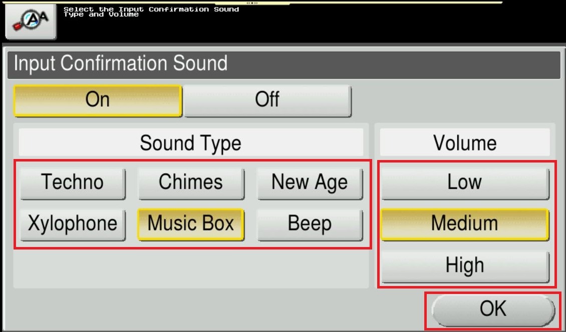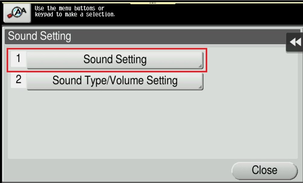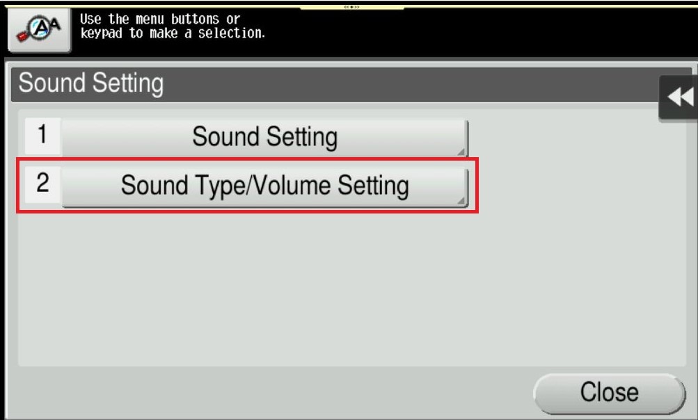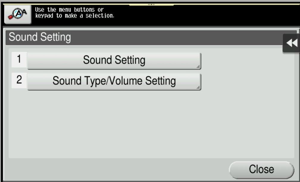 To set the sound type and volume, select [Sound Type/Volume Setting]. Note: The sound type and volume cannot be set for the item where the [Sound Setting] is set to [No].