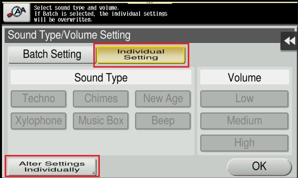 | [Batch Setting] | All the sound type and volume will be at once. Select the sound type from six types and select the sound volume from [High], [Medium] and [Low]. |
