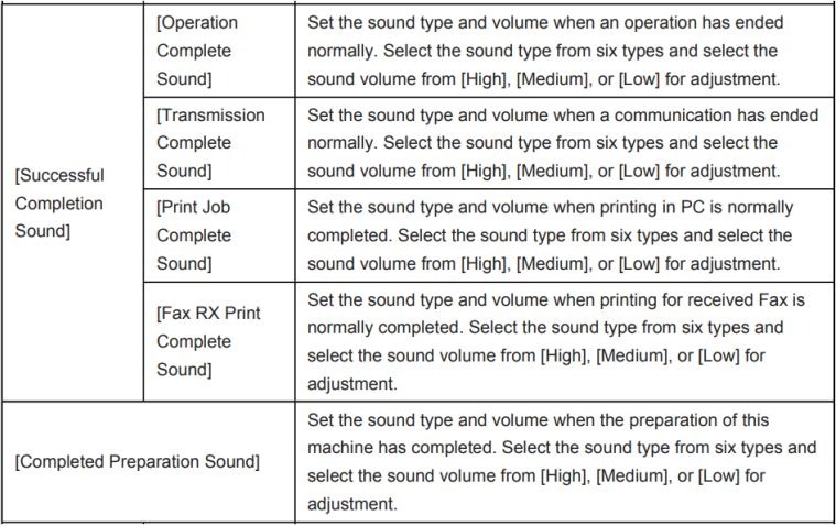 | [Sound Type/Volume Setting] | Specify the sound type and volume for each of [Operation Confirmation Sound], [Successful Completion Sound], [Completed Preparation Sound], [Caution Sound], [Deletion Sound], and [Authentication Sound]. When [Batch Setting] is selected, all the sound type and volume will be set at once. When [Individual Setting] is selected, all the sound type and volume will be set separately. |