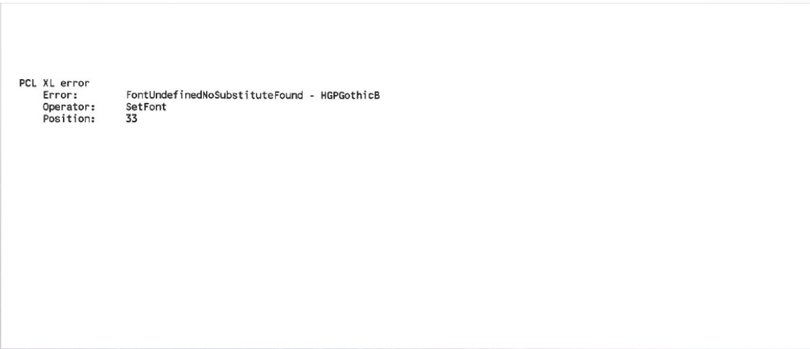 As shown in the example below, when printing certain documents from the PC, the printout includes an error page displaying “PCL XL Error”. This issue commonly occurs when the printer is unable to recognize certain [Fonts] used in the document.