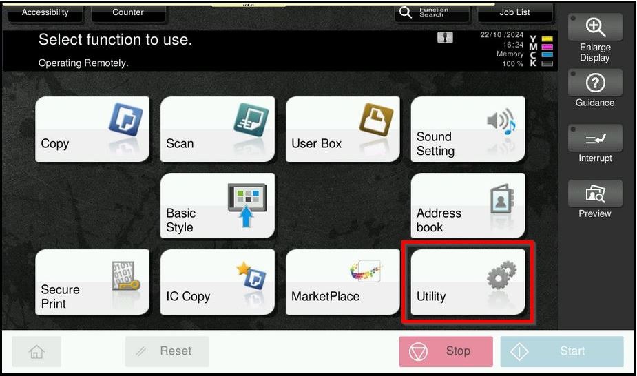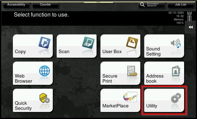 STEP 1 – On the Konica Minolta machine, press on [Menu] button and select [Utility].