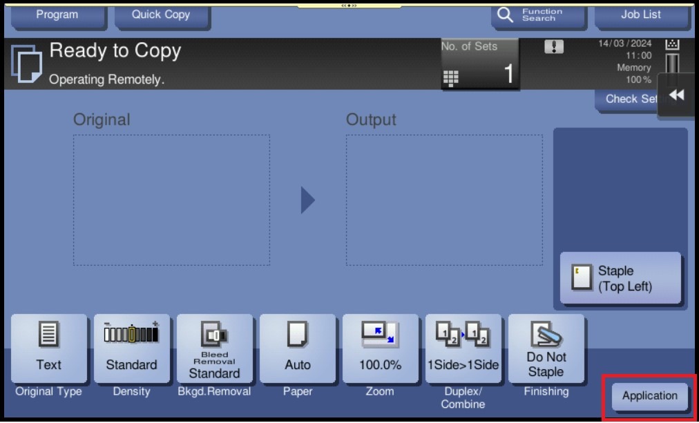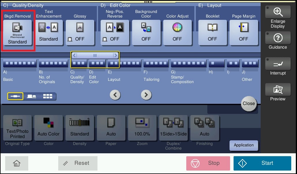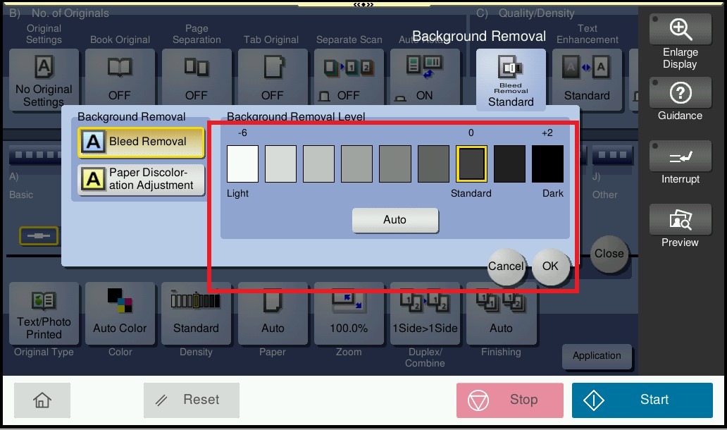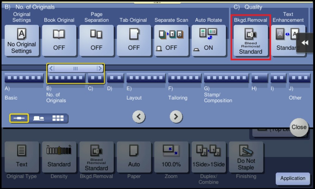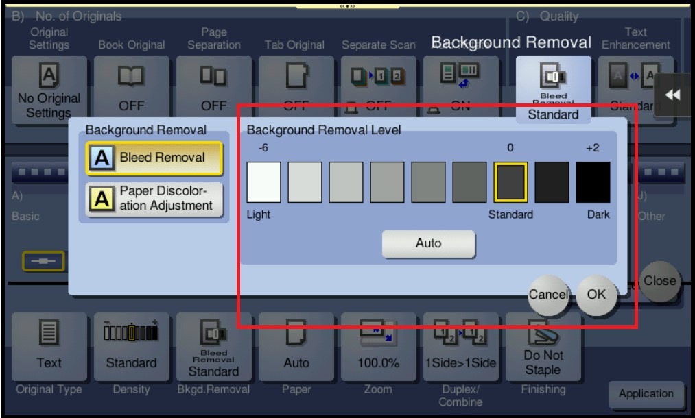 STEP 3 – Select the [Bkgd.Removal] under [Quality/Density] Then Adjust the density of original with the colored background (newspaper, recycle paper, etc.) or the background of an original that is so thin that text or images on the back would be scanned.