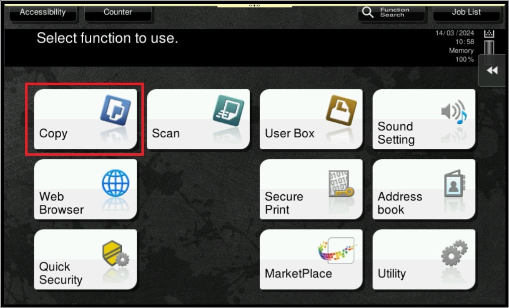 STEP 1 – On the Main Menu Screen, select [Copy] icon.