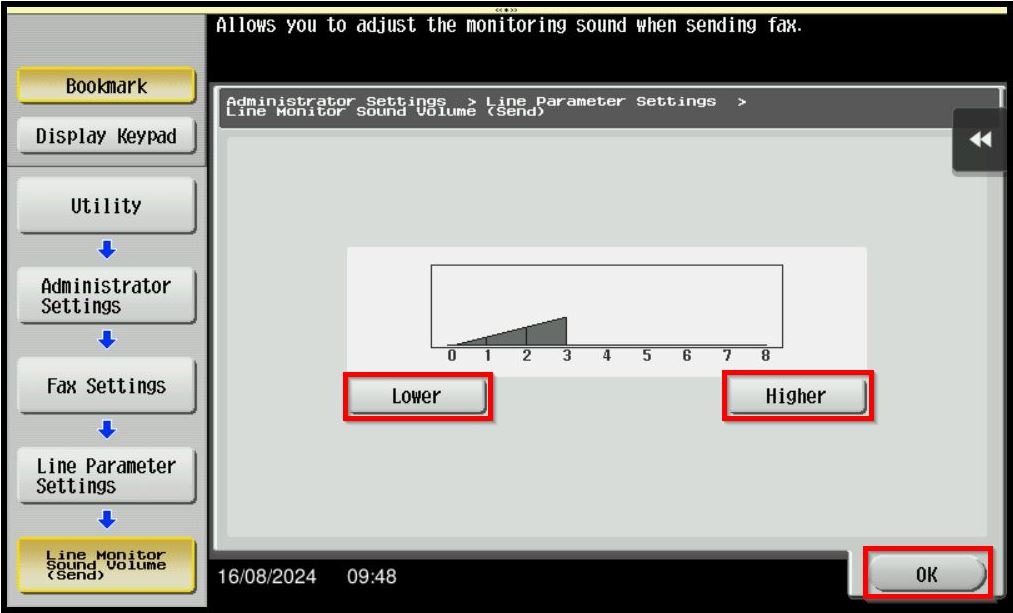 STEP 7 – Select [Lower] or [Higher] to adjust the fax volume. After that click [OK] to save.