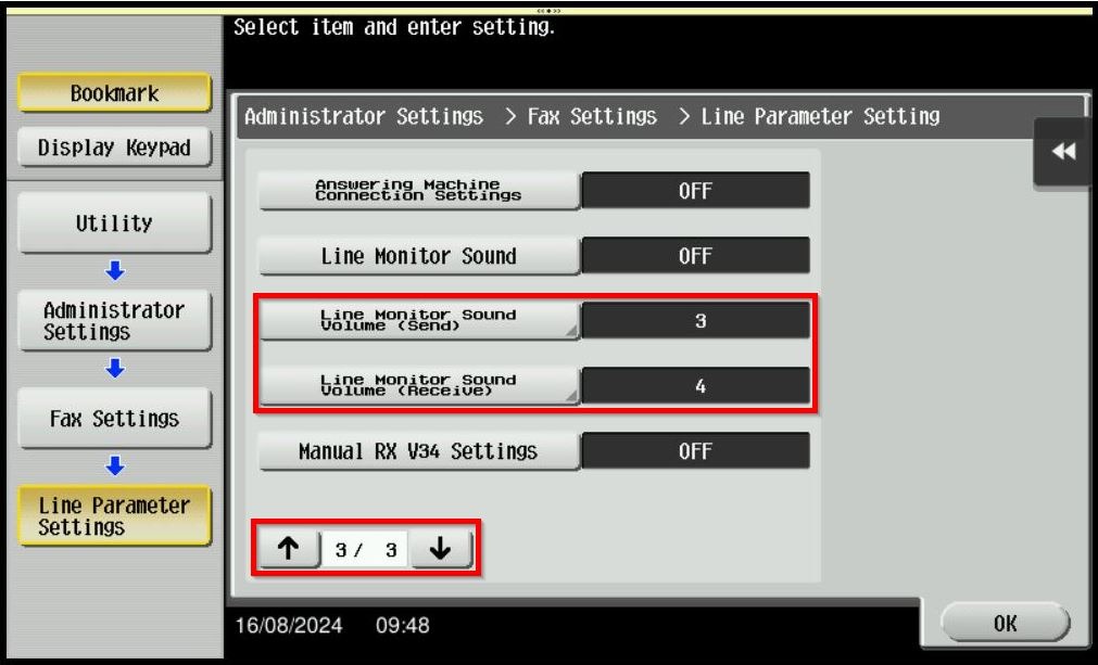 STEP 6 – Navigate to [3rd page], select [Line Monitor Sound Volume (Send)] and [Line Monitor Sound Volume (Receive)].