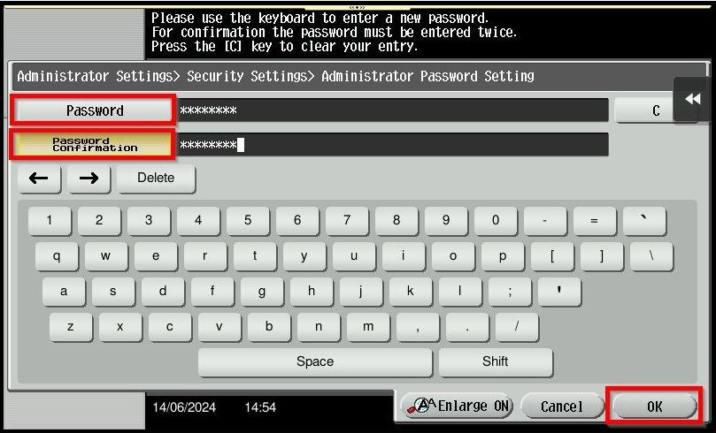 STEP 8 – Click [Password], [Password Confirmation] and key in the new administrator password. After that click [OK] button to save.