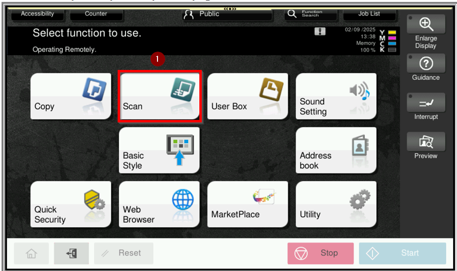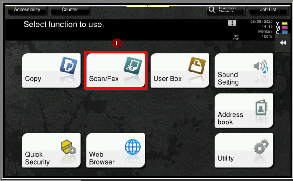 STEP 1 –  On the Konica Minolta machine control panel, click on the [Menu] button then select [Scan].