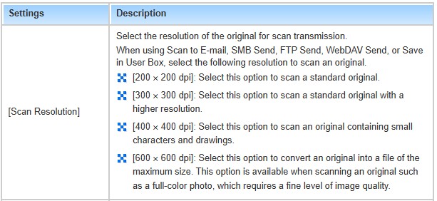 STEP 3 – Select [Scan Resolution] according to the required output. For larger sized documents, it is recommended to use [200 x 200 dpi] to reduce the file size. Kindly refer to the chart below for your reference.