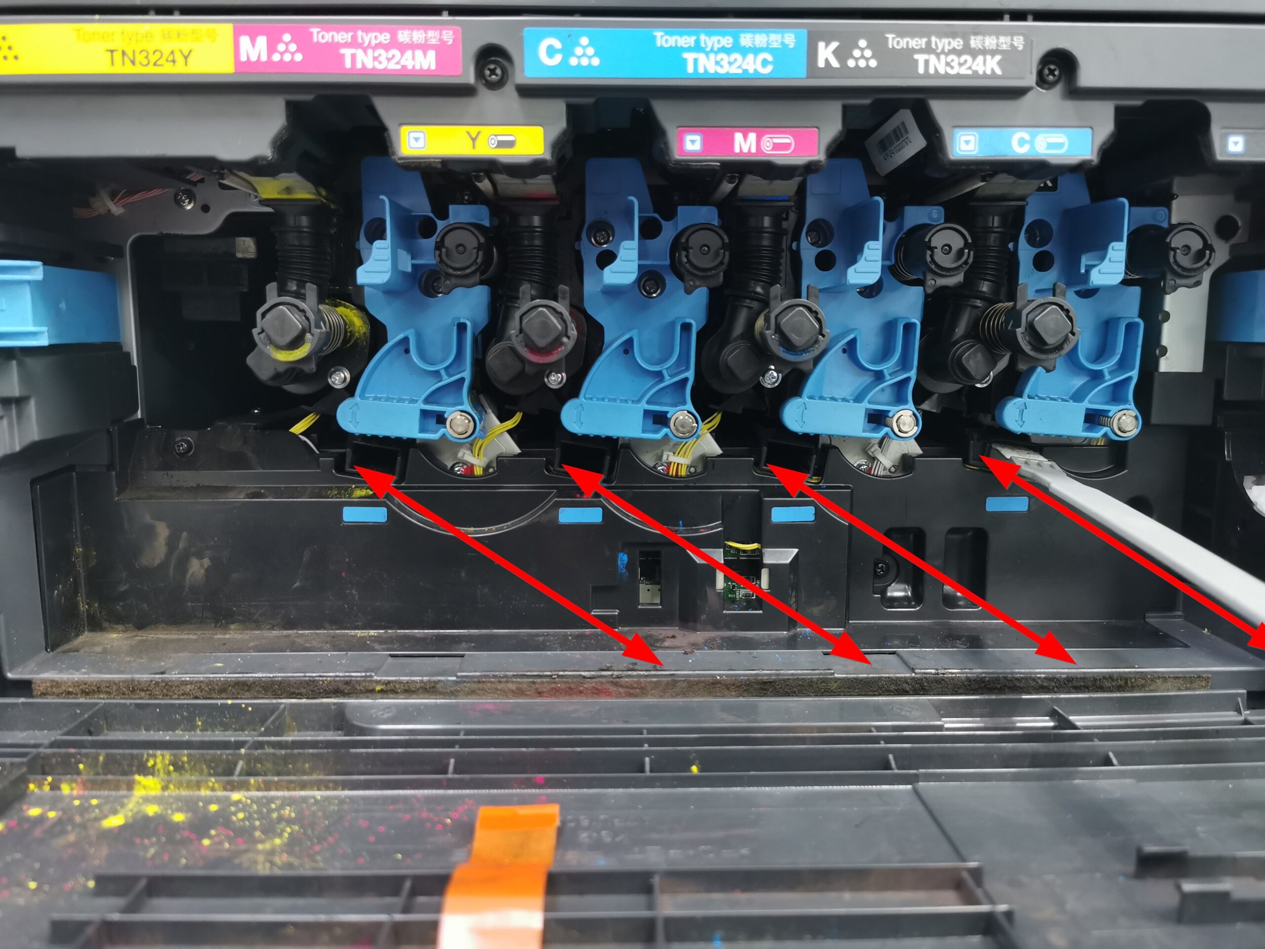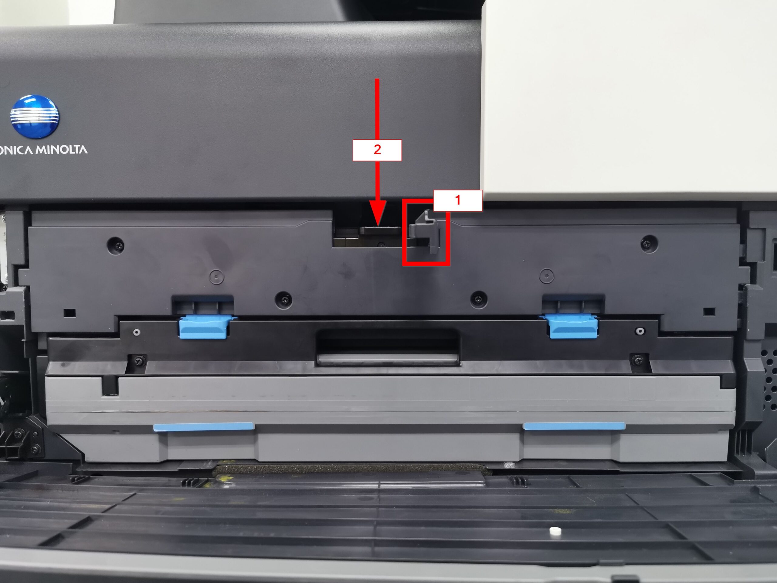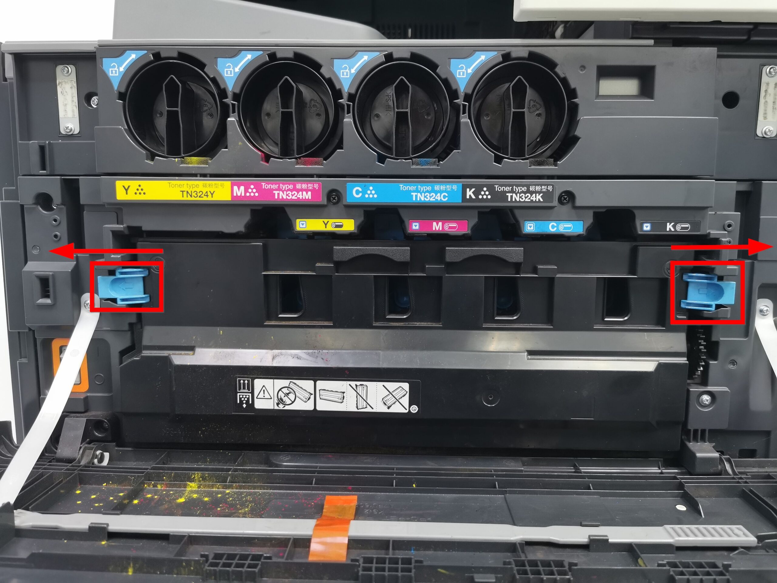 STEP 2 – Release the [Waste Toner Box Lock Lever] and carefully remove the [Waste Toner Box] from the machine.
