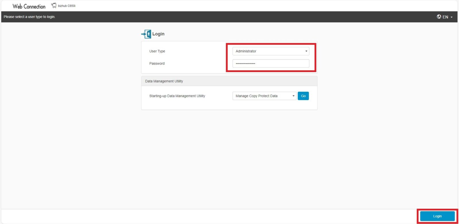 STEP 3 – Select [Administrator] option and enter administrator password, click on Login.