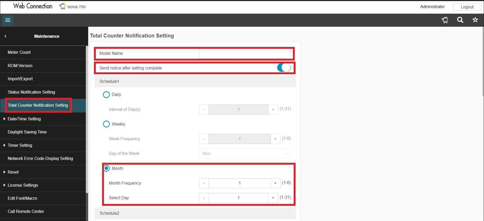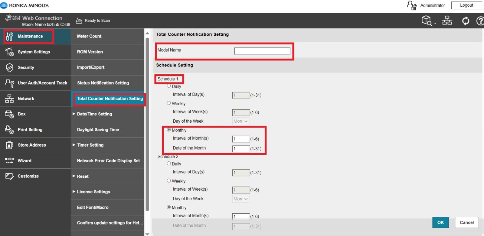 STEP 5 – Select [Maintenance] – [Total Counter Notification Setting], Key in the information below. Then click [OK] to save the setting.