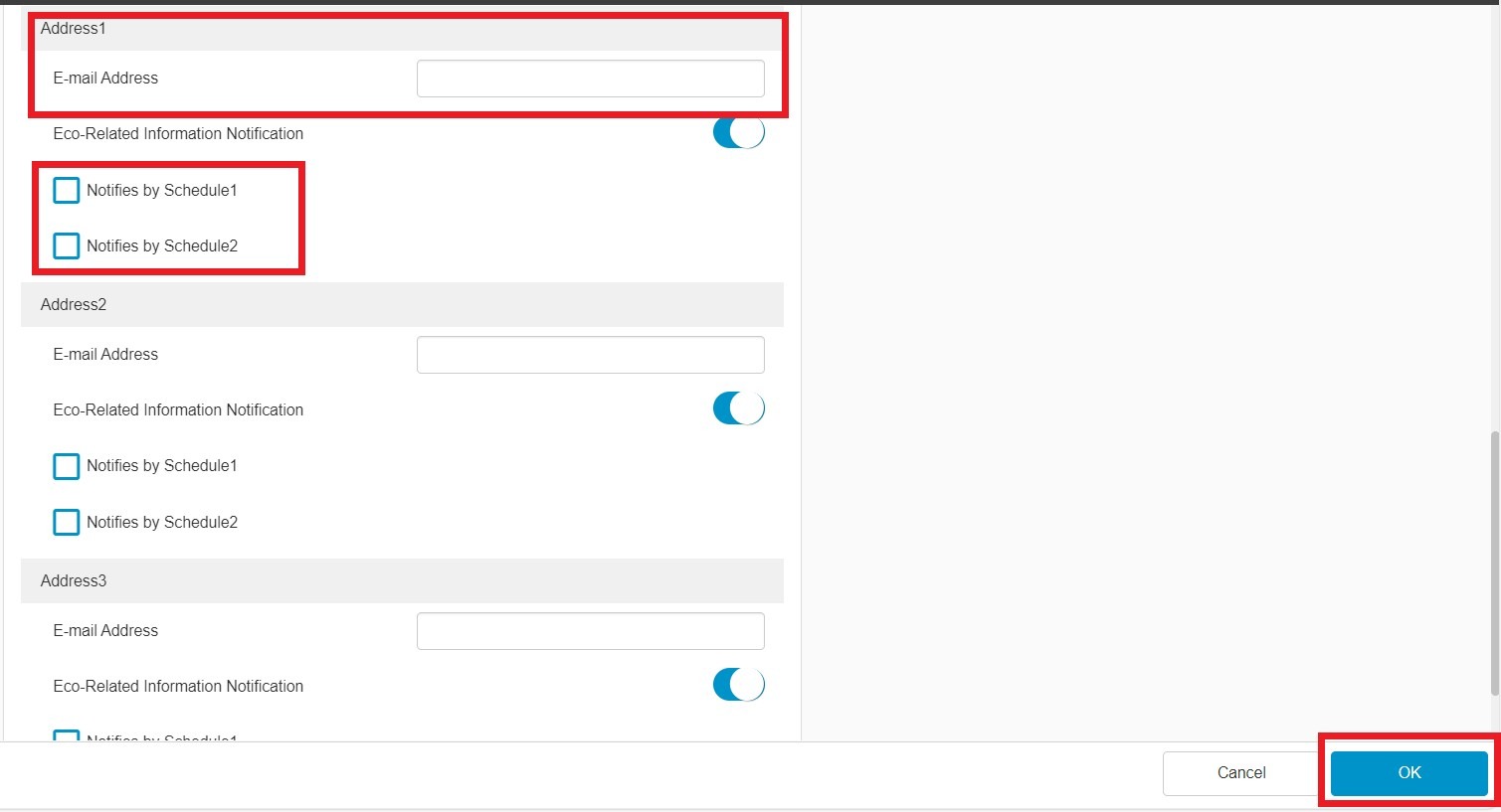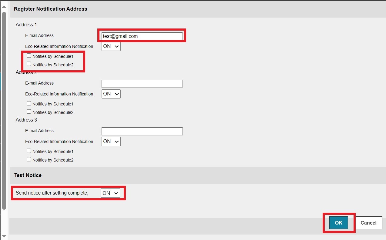 • [Send notice after setting complete]: set to ON so it able to send test notice whether the test scan to email able to receive successfully.
