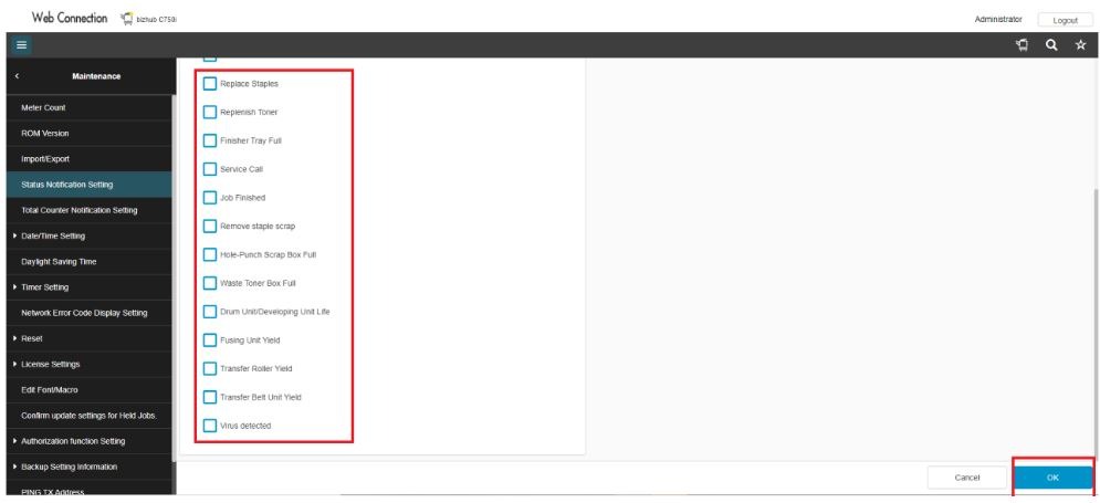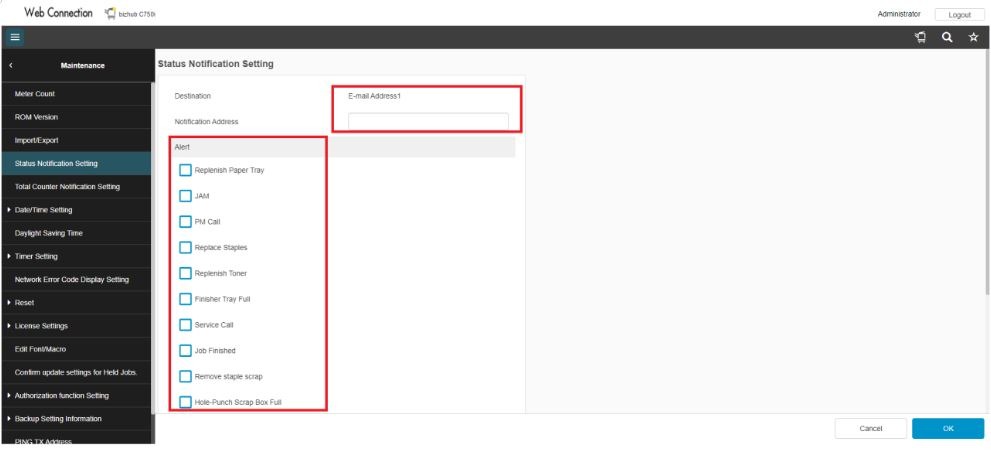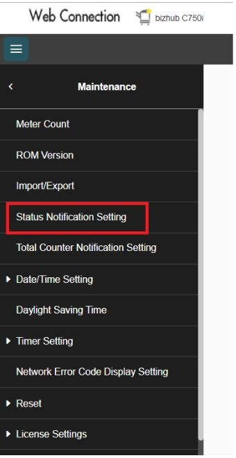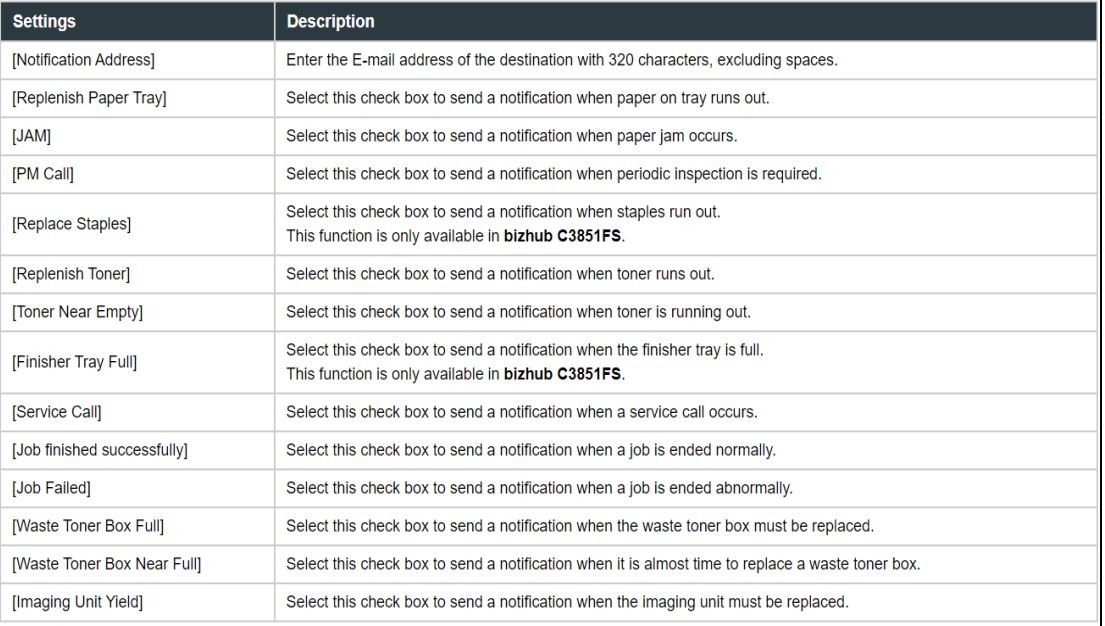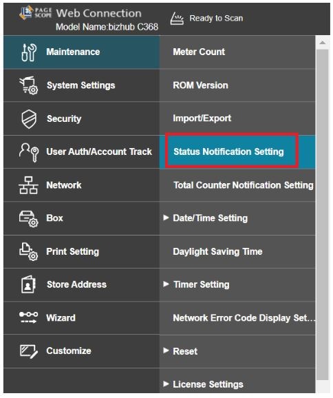 This setting is to register destination E-mail addresses on machine to receive a notification when the error code machine occurs. Before setup the status notification settings, the machine need to be setup scan to email in order to able to receive alert via email, click here on how to setup scan to email on machine.