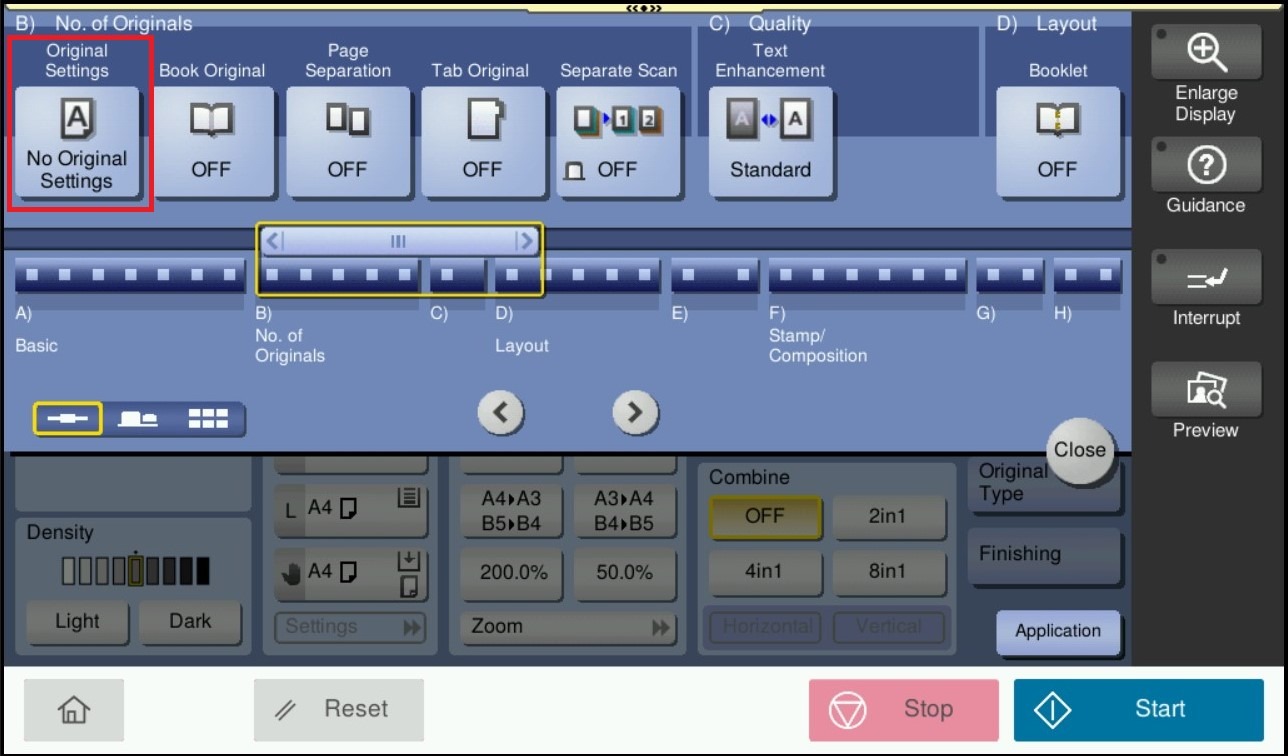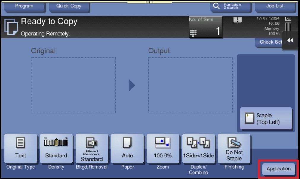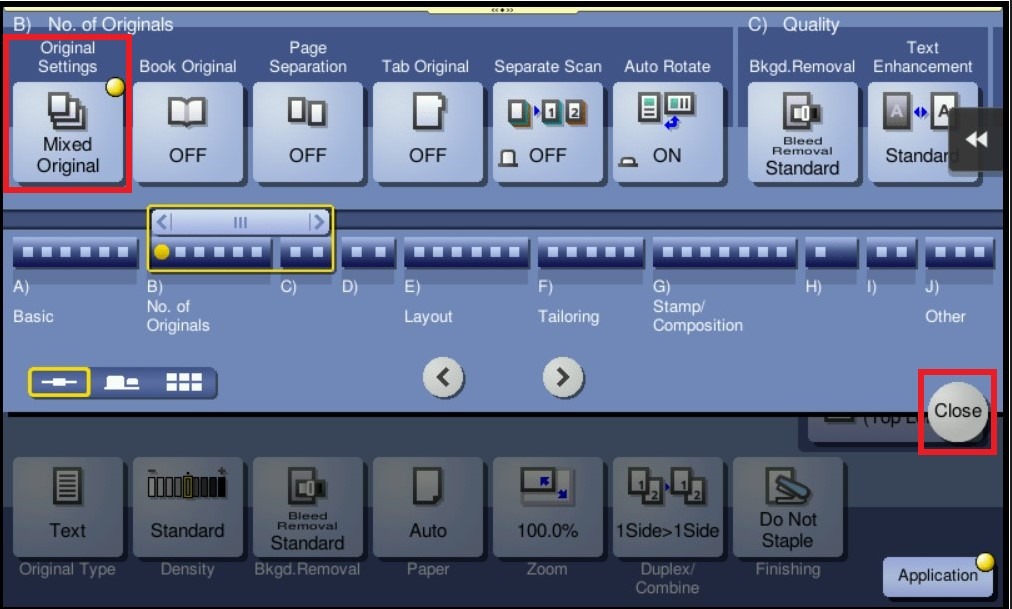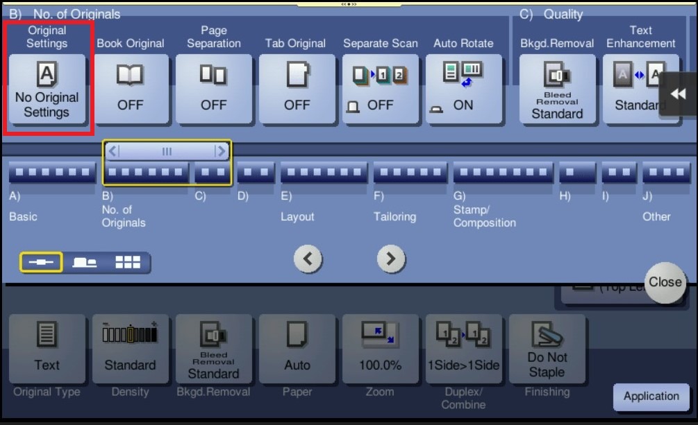 STEP 2 – Select [Application] – [Original Settings] under No. of Originals Tab.