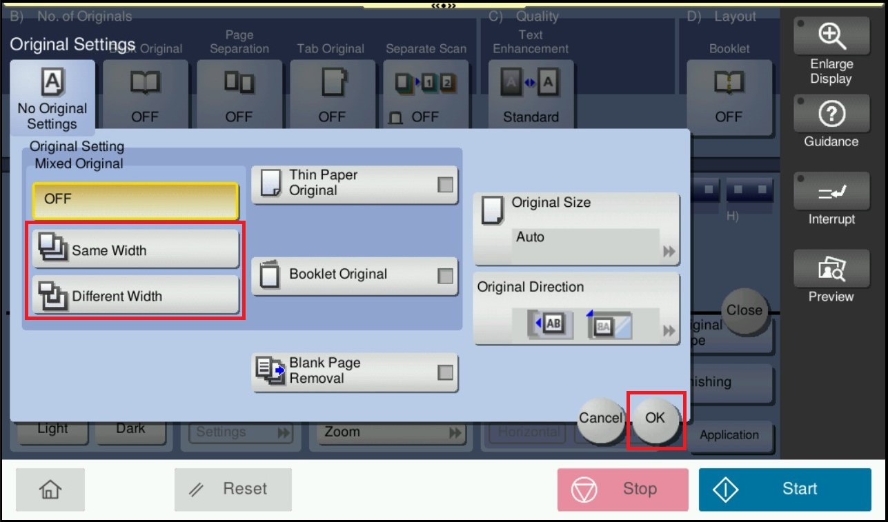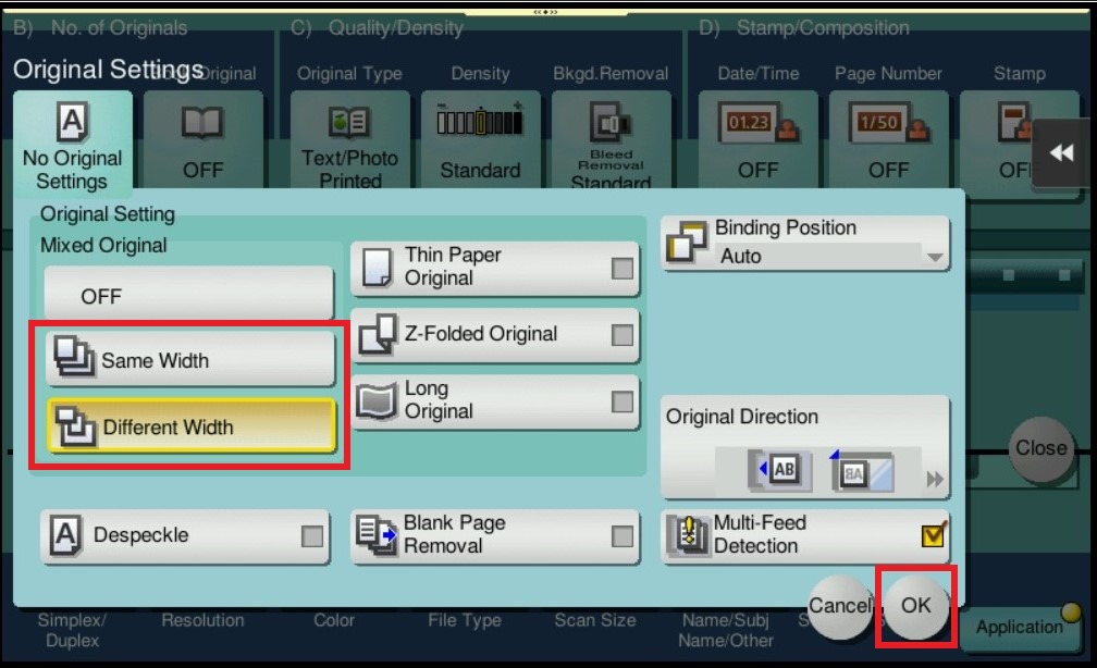 STEP 3 – If the widths of the originals are the same, select [Same Width]. If the widths of the originals are different, select [Different Width]. click [OK] to save the settings.