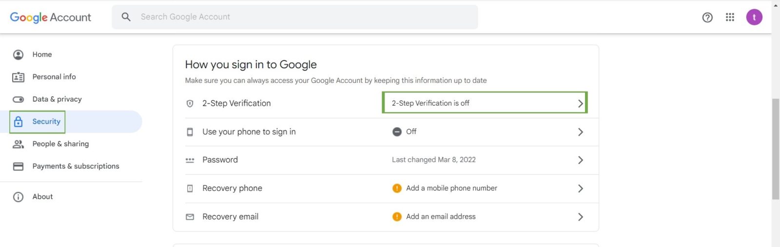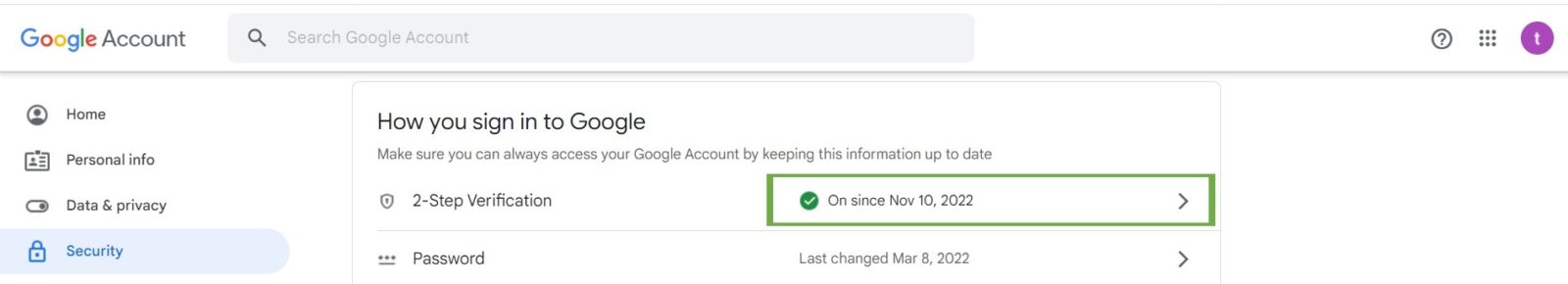 STEP 2 – Select Security and click on 2-Step Verification.
