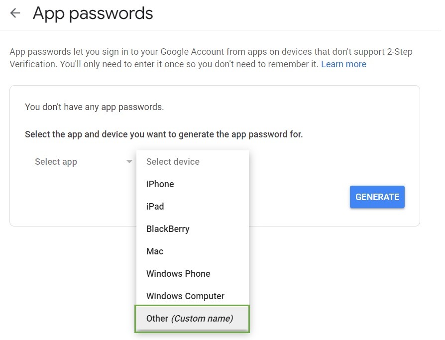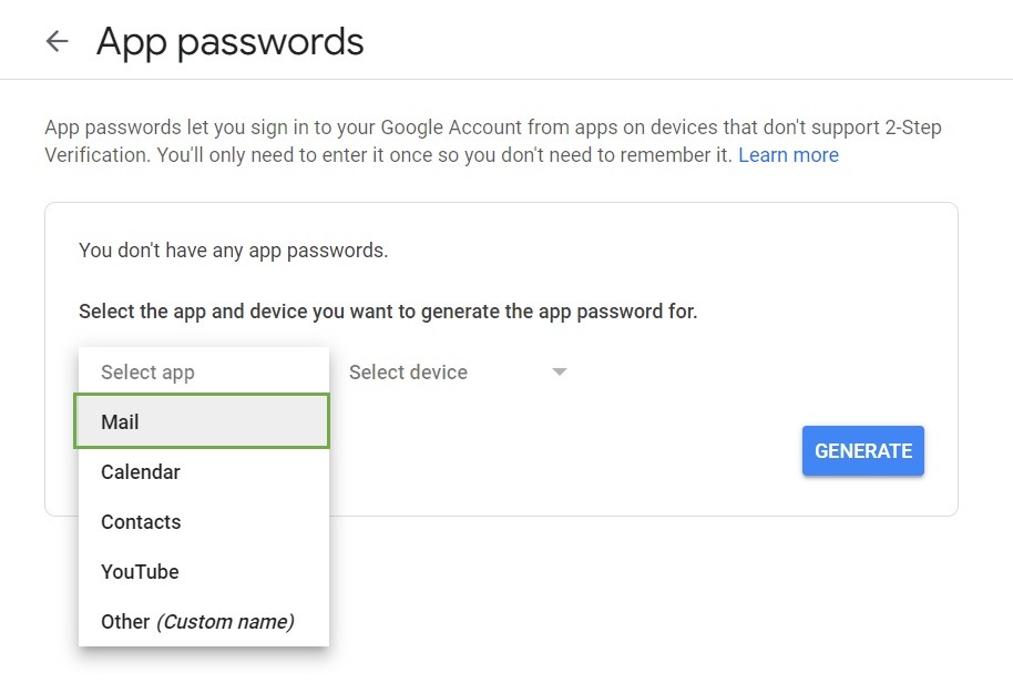STEP 4 – Follow below step by select Mail on select app, Others (Custom Name) on select devices, name the device and Click on Generate,