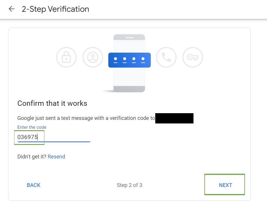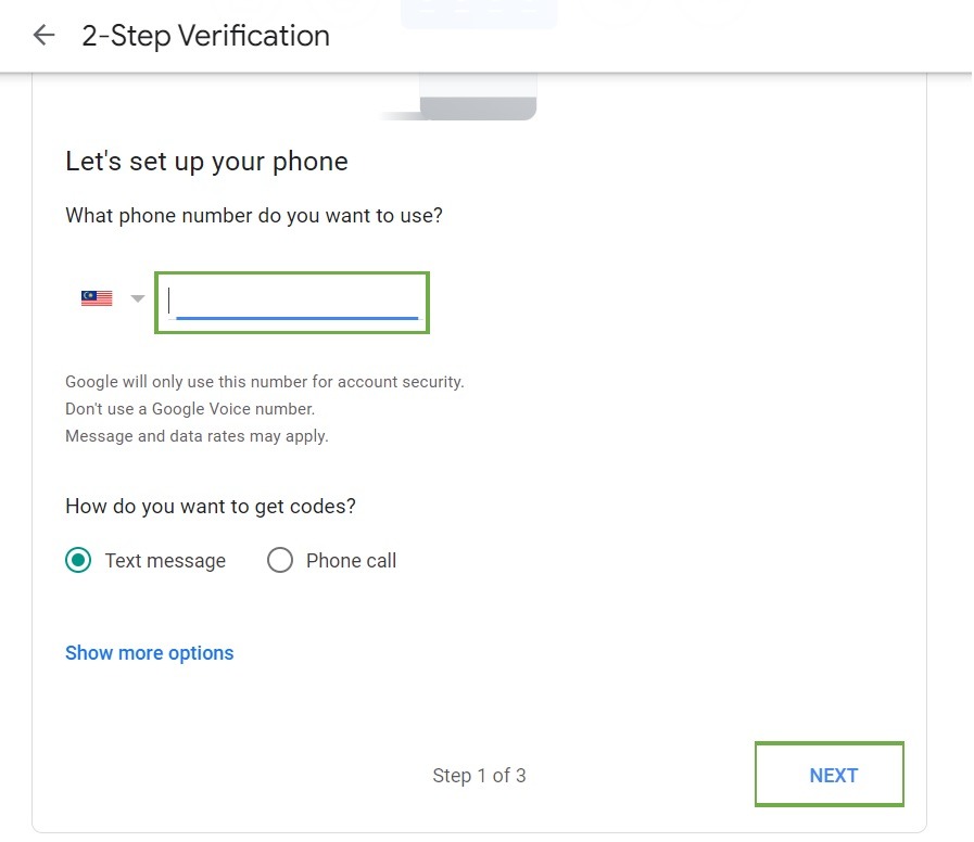 STEP 3 – Follow below step by key In the Handphone number and enter the Google verification code to switch ON the 2-Step Verification.