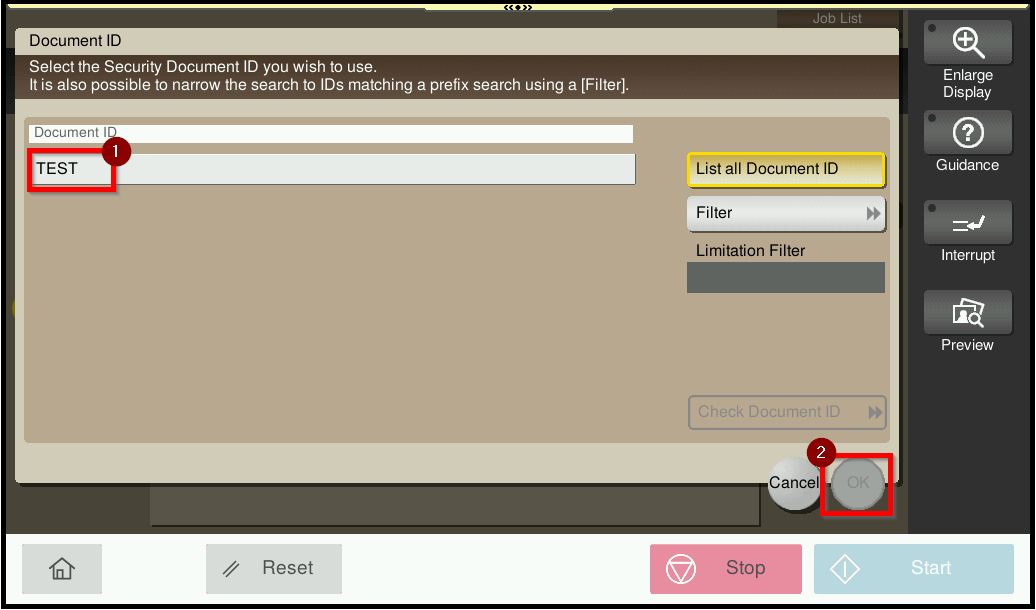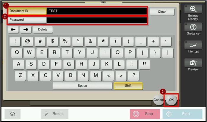 Option 1: Do Not Release Secure Print: The attachment below shows that users are required to enter both Document ID and Password to release the Secure Print job.