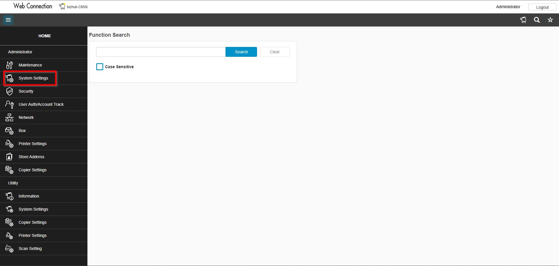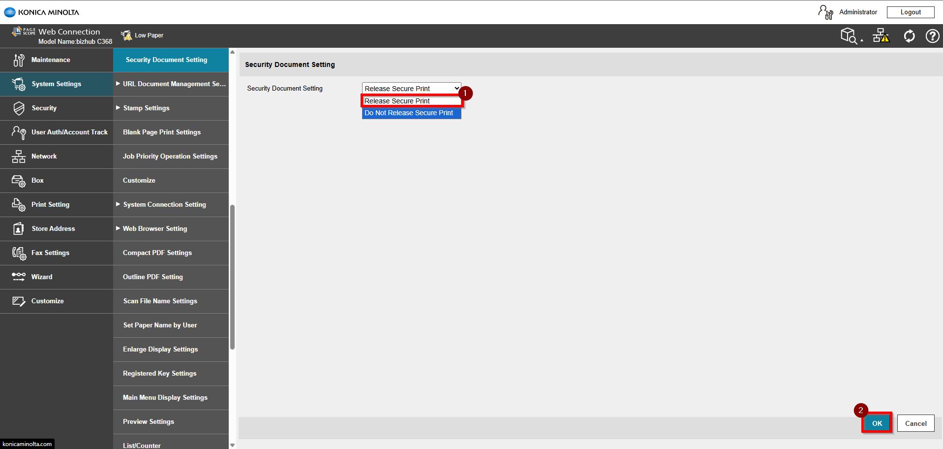 STEP 2 – Select [Administrator Settings] and Key in the default administrator password and click [OK] button to login.