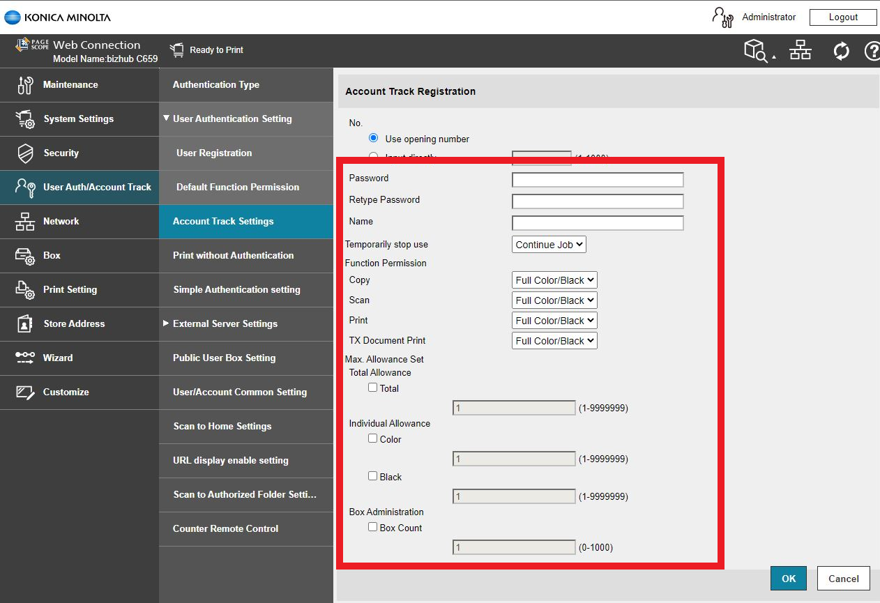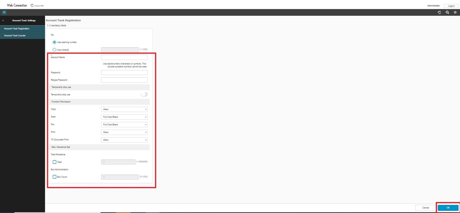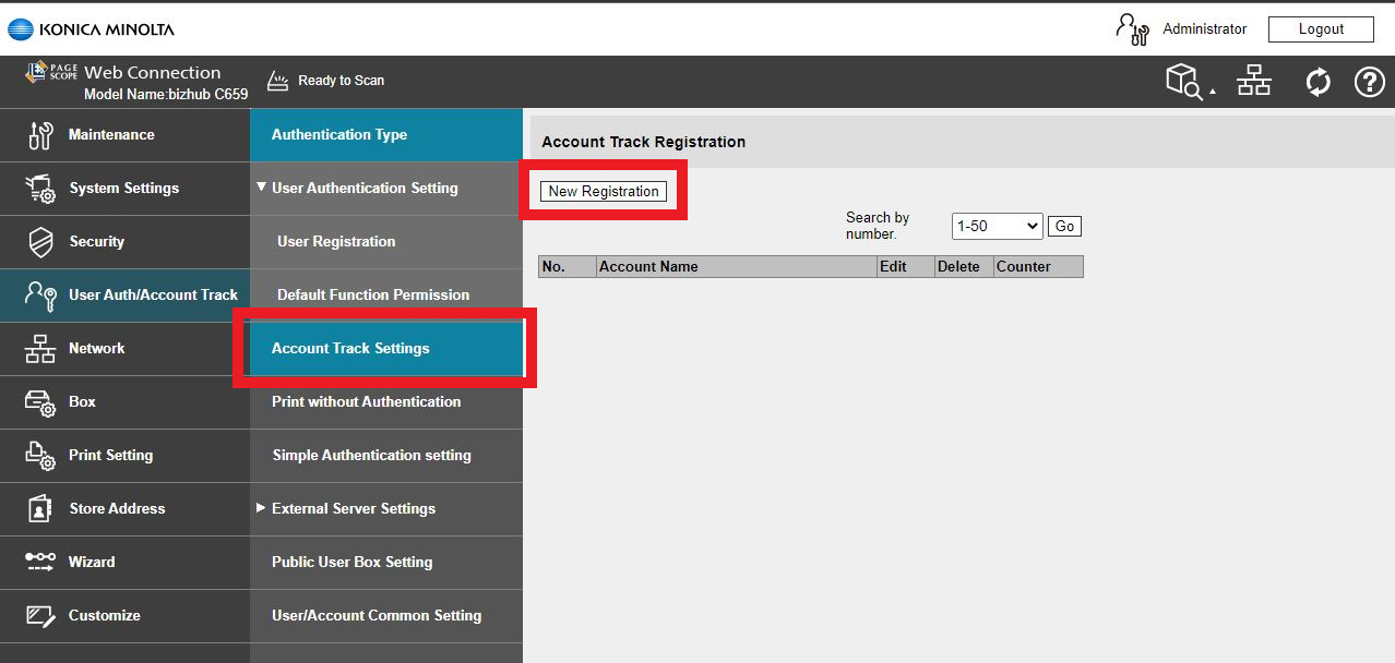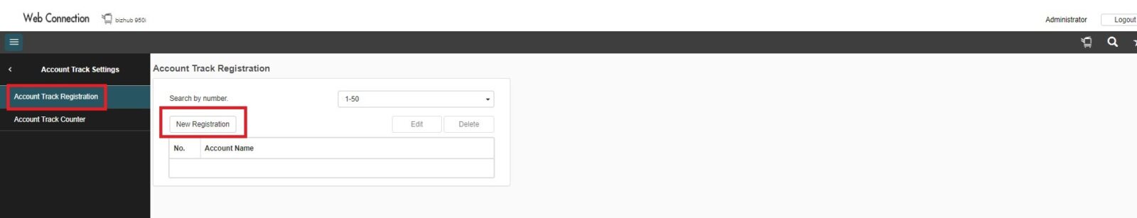 STEP 5: Register a Username and Password, on the machine Administrator mode go to [User Auth/Account Track] > [Account Track Settings] > then click [New Registration] to register a new use