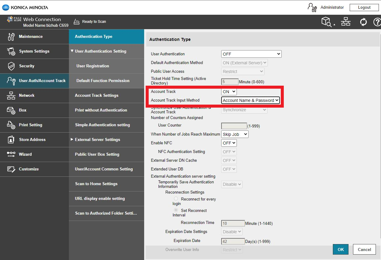 STEP 3: Logout from public then login as Administrator and go to [User Auth/Account Track] > [General Settings] OR [Authentication Type] > Turn ON Account Track and set the Account Track Input Method to [Account Name & Password] or [Password only].