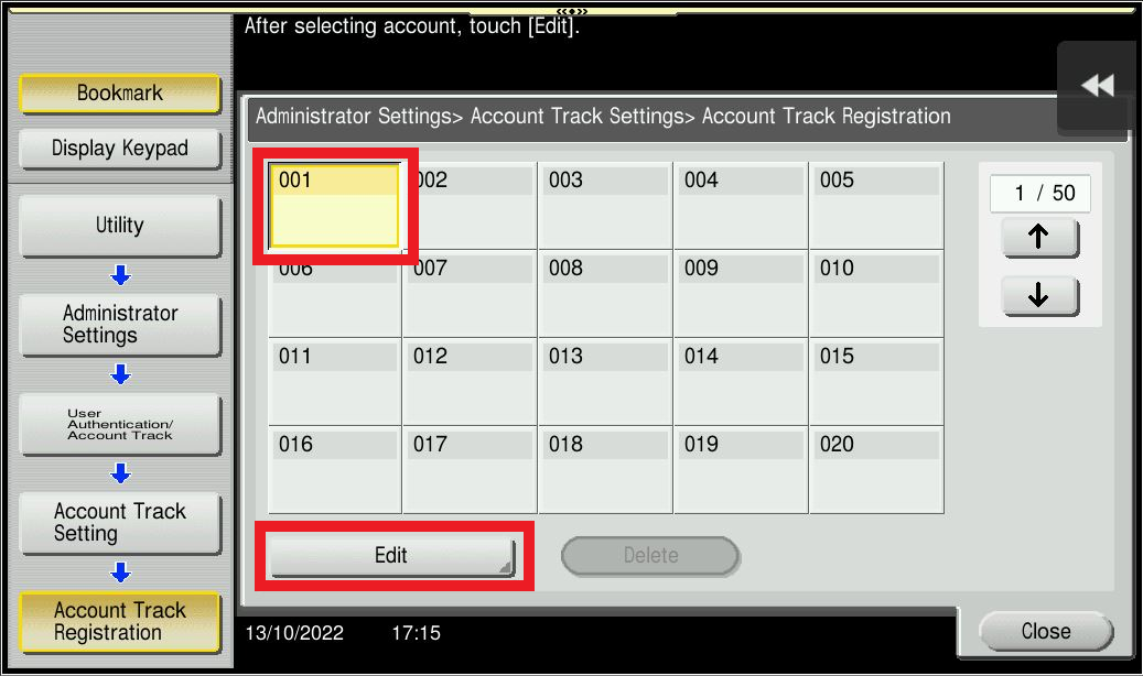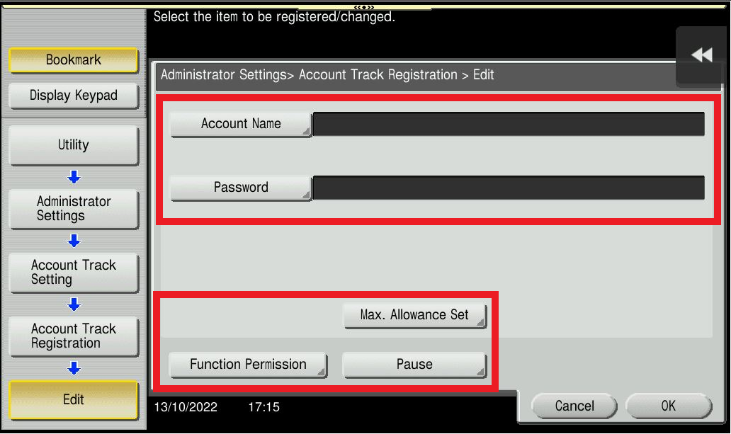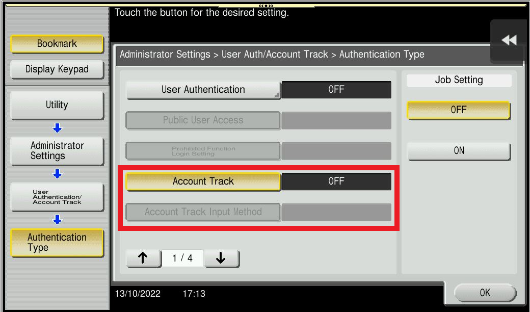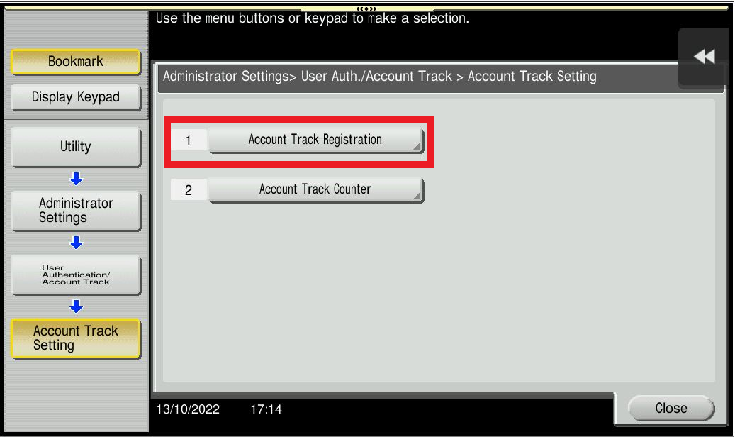 STEP 1: On the machine Control Panel, click [Menu] > [Utility] > [Administrator Settings] > [User Authentication/Account Track] > [General Settings] or [Authentication Type] > Turn ON Account Track and set the Account Track Input Method to [Account Name & Password] or [Password only].