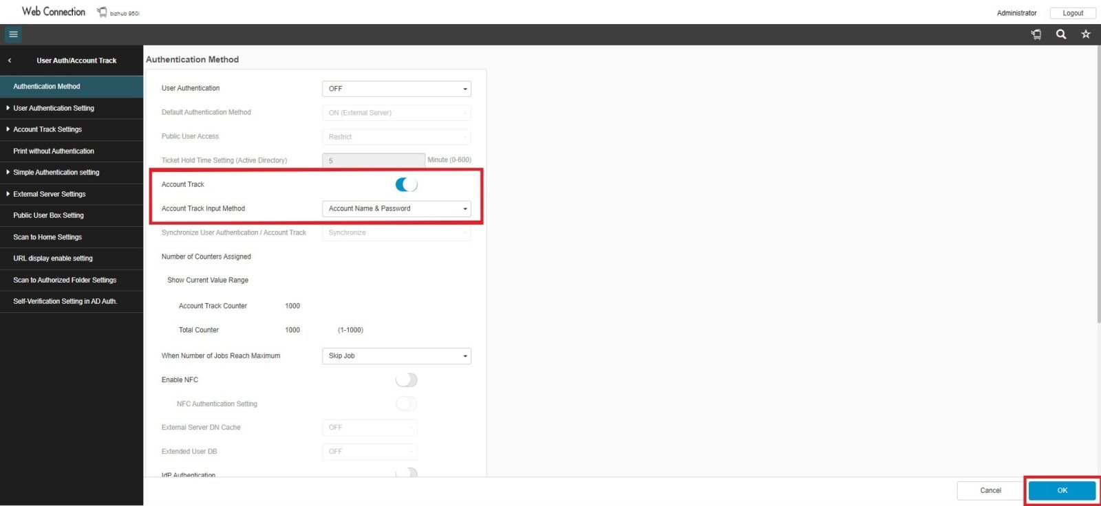 STEP 3: Logout from public then login as Administrator and go to [User Auth/Account Track] > [Authentication Method] > Turn ON Account Track and set the Account Track Input Method to [Account Name & Password] or [Password only].