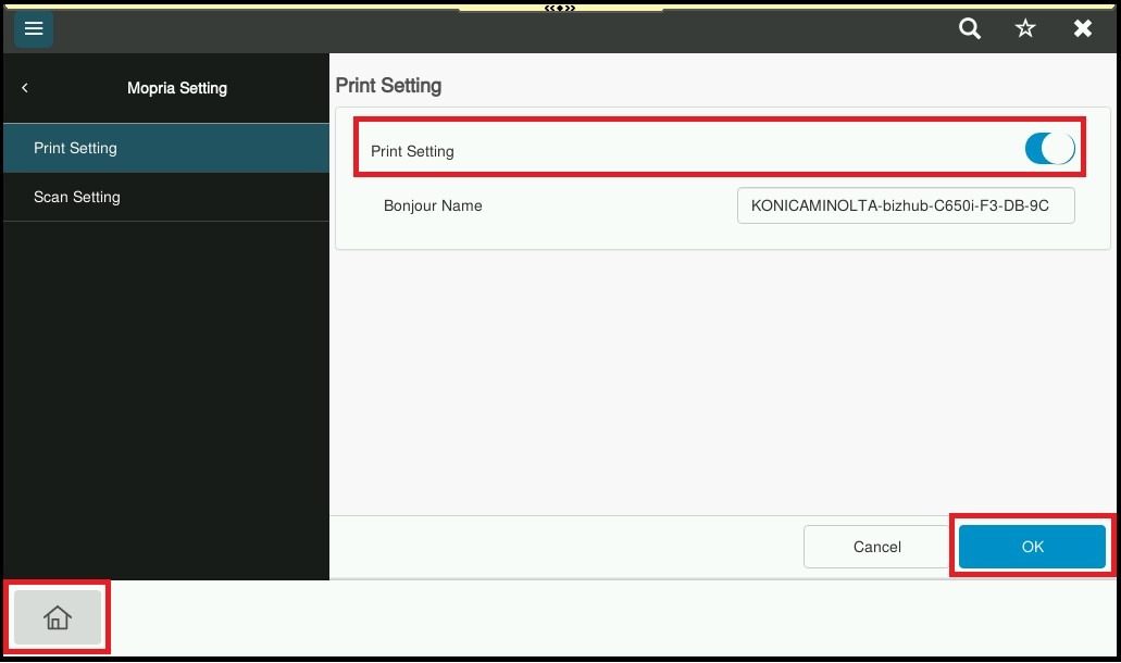 STEP 4 – Select [Print Setting], enable the setting then click [OK] to save the setting. Click on [Home] icon to exit from admin setting.