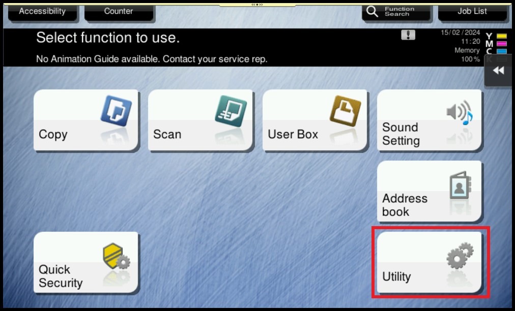 STEP 1 – On the Konica Minolta machine, click on [Menu] button, Select [Utility] from Control Panel.