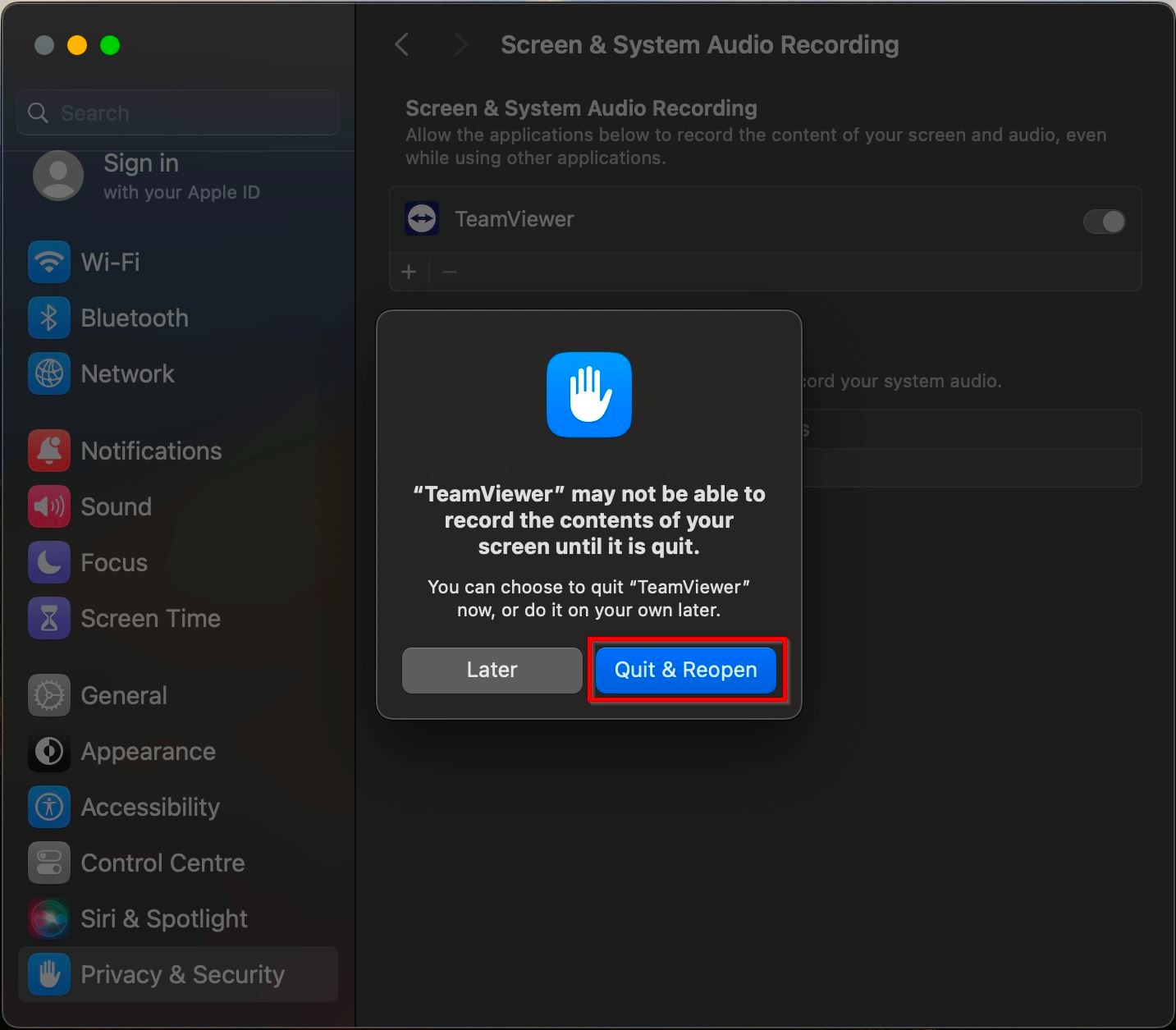STEP 6 – Click on [Quit & Reopen] and now the Mac will be able to access by using TeamViewer.