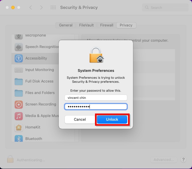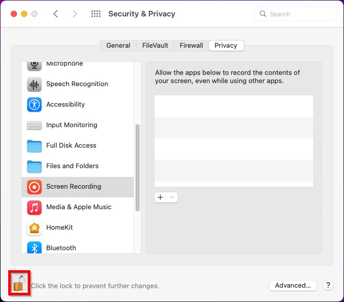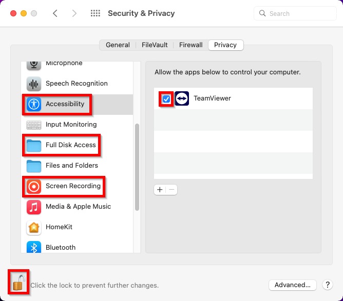 Step 3 – Check if the Teamviewer is enable in the [Accessibility], [Full Disk Access] and [Screen Recording], if not then [Tick] on the Teamviewer to enable. (If the tick button is gray out, click on the [Lock] icon to unlock)