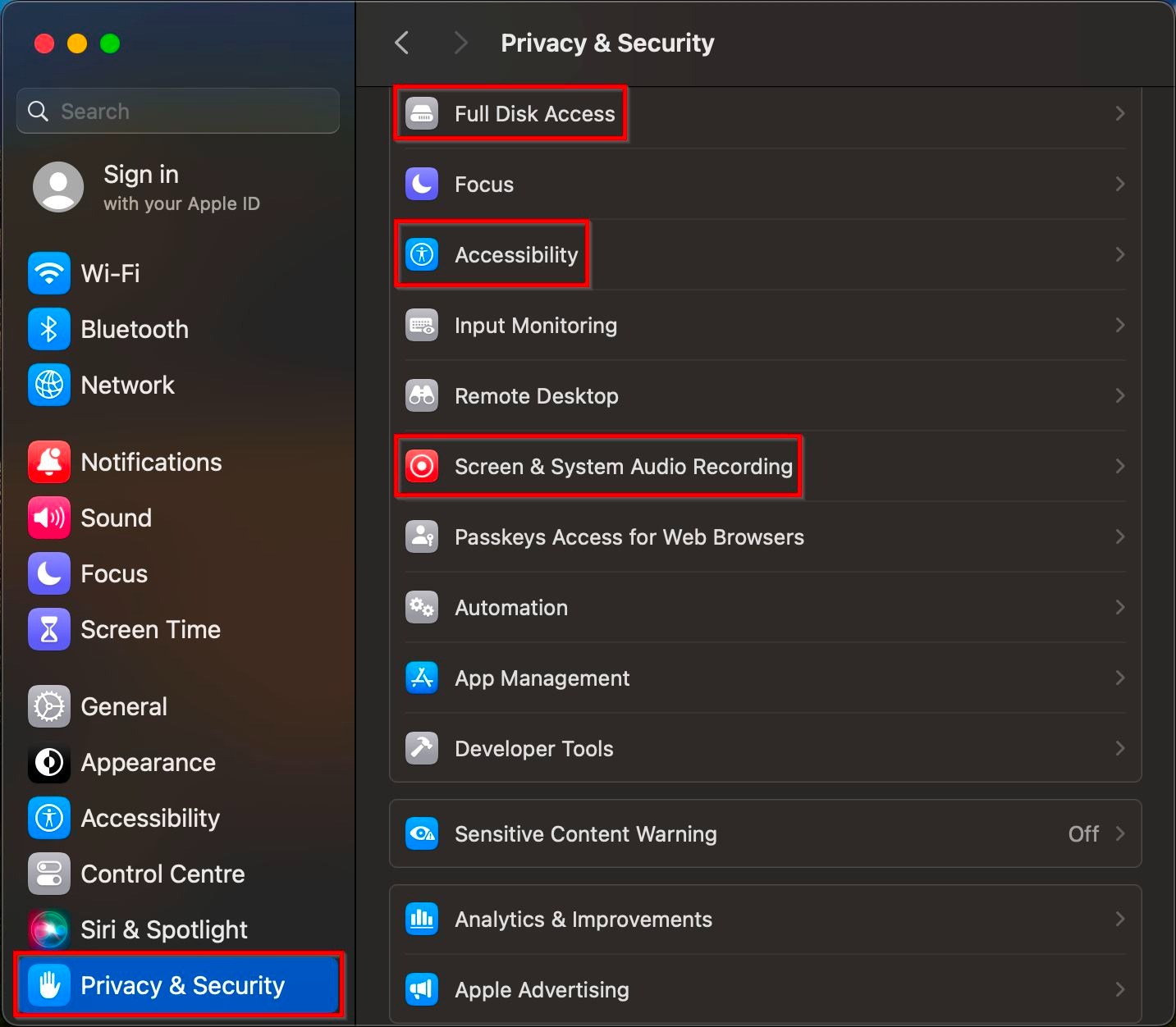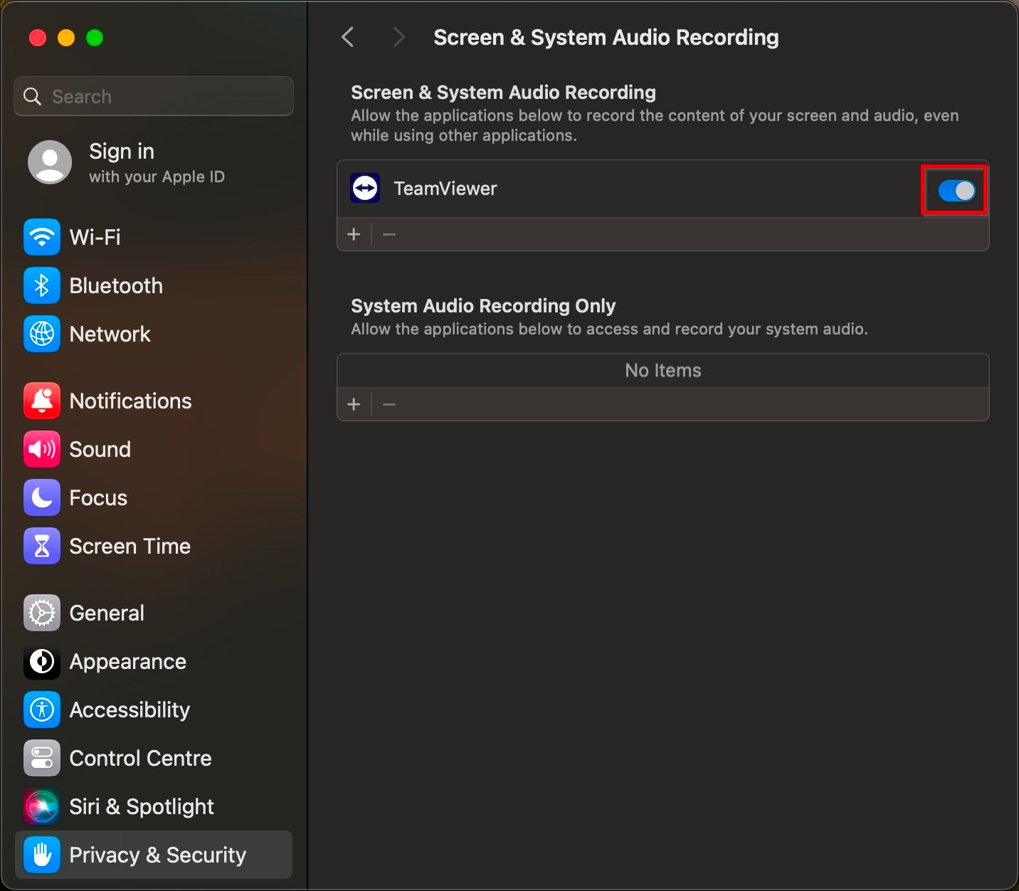 STEP 2 – Click on [Privacy & Security] and check is the TeamViewer is enable in the [Full Disk Access], [Accessibility] and [Screen & System Audio Recording].