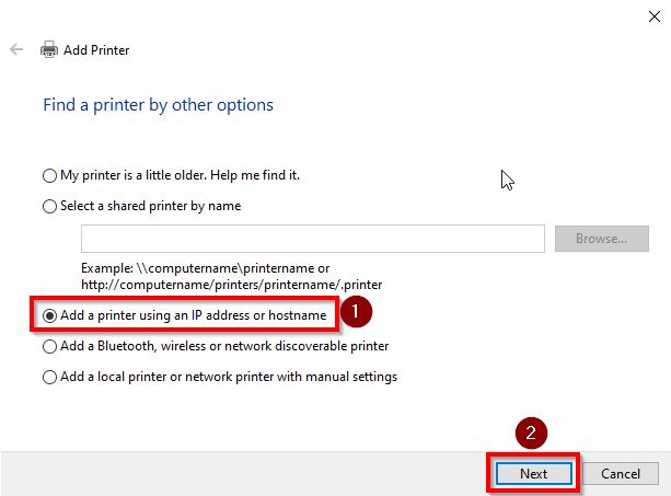 STEP 4 – Choose [Add a printer using TCP/IP address or Hostname] then click [Next].