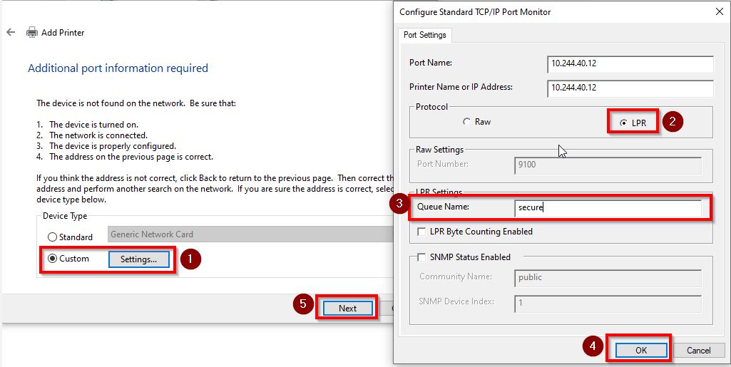 STEP 9 – Select [Custom] – [Settings], change the protocol to [LPR], key in Queue Name as [secure], then proceed to click on [OK] – [Next].