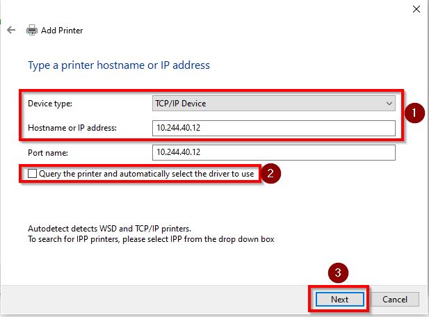 STEP 7 – Change the Device Type to [TCP/IP Device] and type in the [SafeQ IP Address] and [untick] the option “Query the printer and automatically select the driver to use” then click [Next].