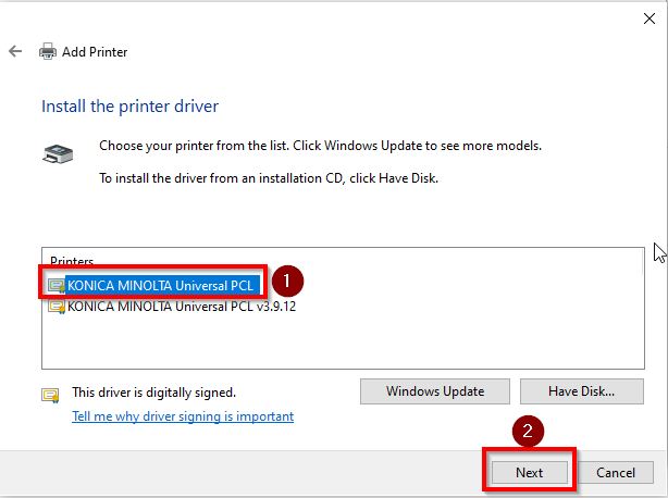 STEP 11 – Select the [Konica Minolta Universal PCL] and click [Next] to install Printer Driver.
