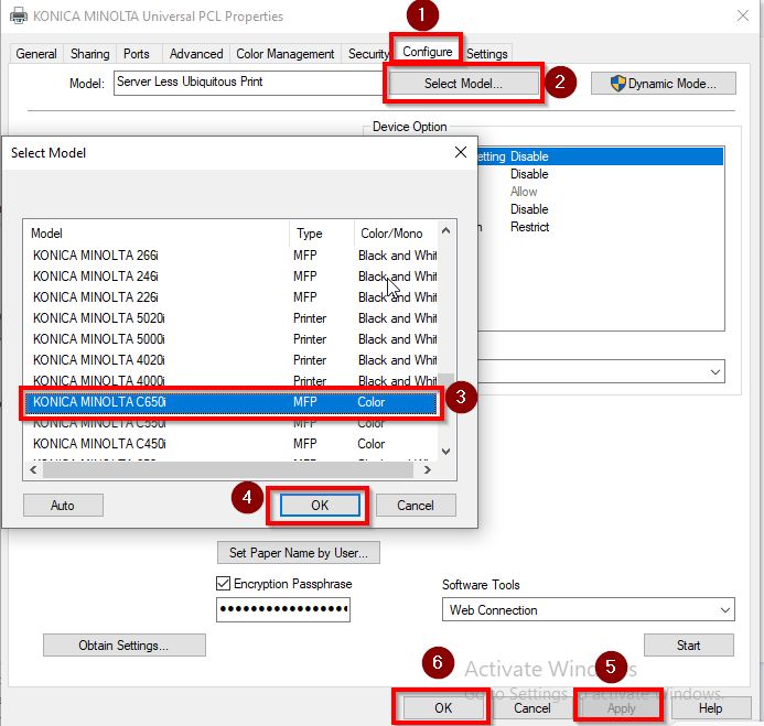 STEP 10 – After installation, the printer driver will appear on the printer list. Right click of the printer and select [Printer Properties] – [Configure] tab – [Select Model] as we need to manually specific correct machine model before printing, as below example is for the Printer Model C650i. Once the correct printer model has been selected, proceed to click on [OK] – [Apply] – [OK] to save the setting.