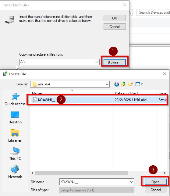 STEP 10 – Click on [Have Disk], select [Browse] and look for the Printer Driver folder that you extracted previously under [UPDPCL6Win_3912030MU\driver\win_x64\KOAWNJ_].