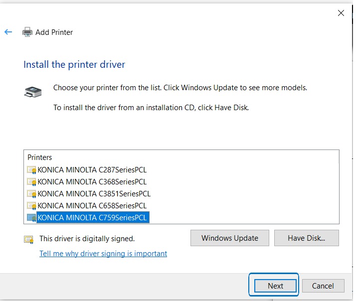 Note: Not all models will be listed on this list, make sure to follow the series number (last number of the model), example is when installing a printer driver for BizHub C308, the model that needs to be selected is the printer driver C368SeriesPCL as both are using the same printer driver (larger model number with the same series number which is 8).