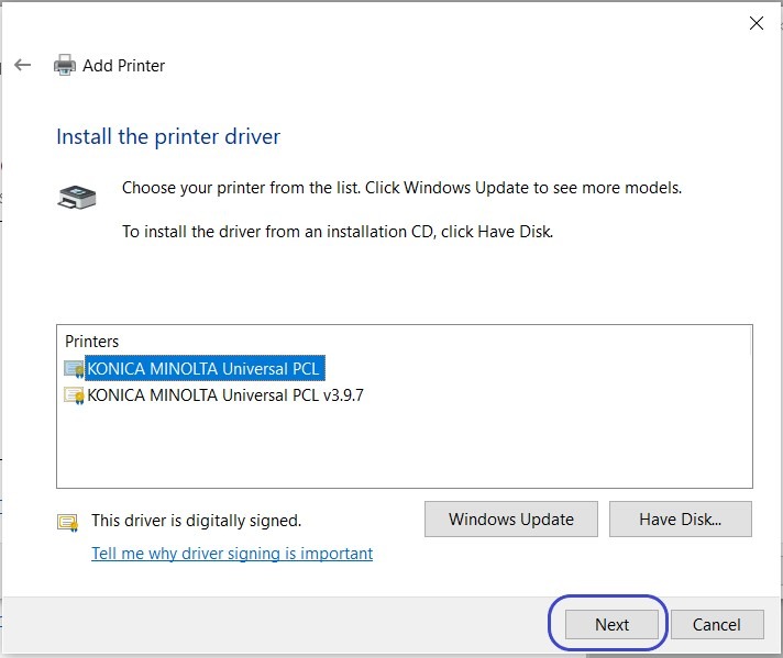 STEP 10 – Select the KONICA MINOLTA Universal PCL and click Next to install Driver.