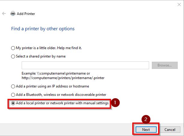 STEP 4 – Choose [Add a local printer or network printer with manual settings] then click [Next].