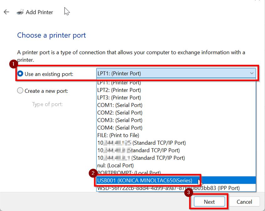 STEP 5 – Under Use an existing port, select [USB001] then proceed to [Next].