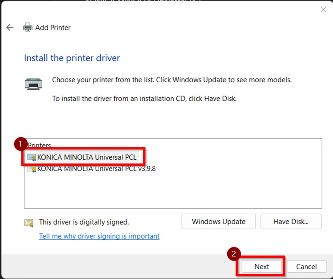 STEP 7 – Select the [KONICA MINOLTA Universal PCL] and click [Next] to install Driver.