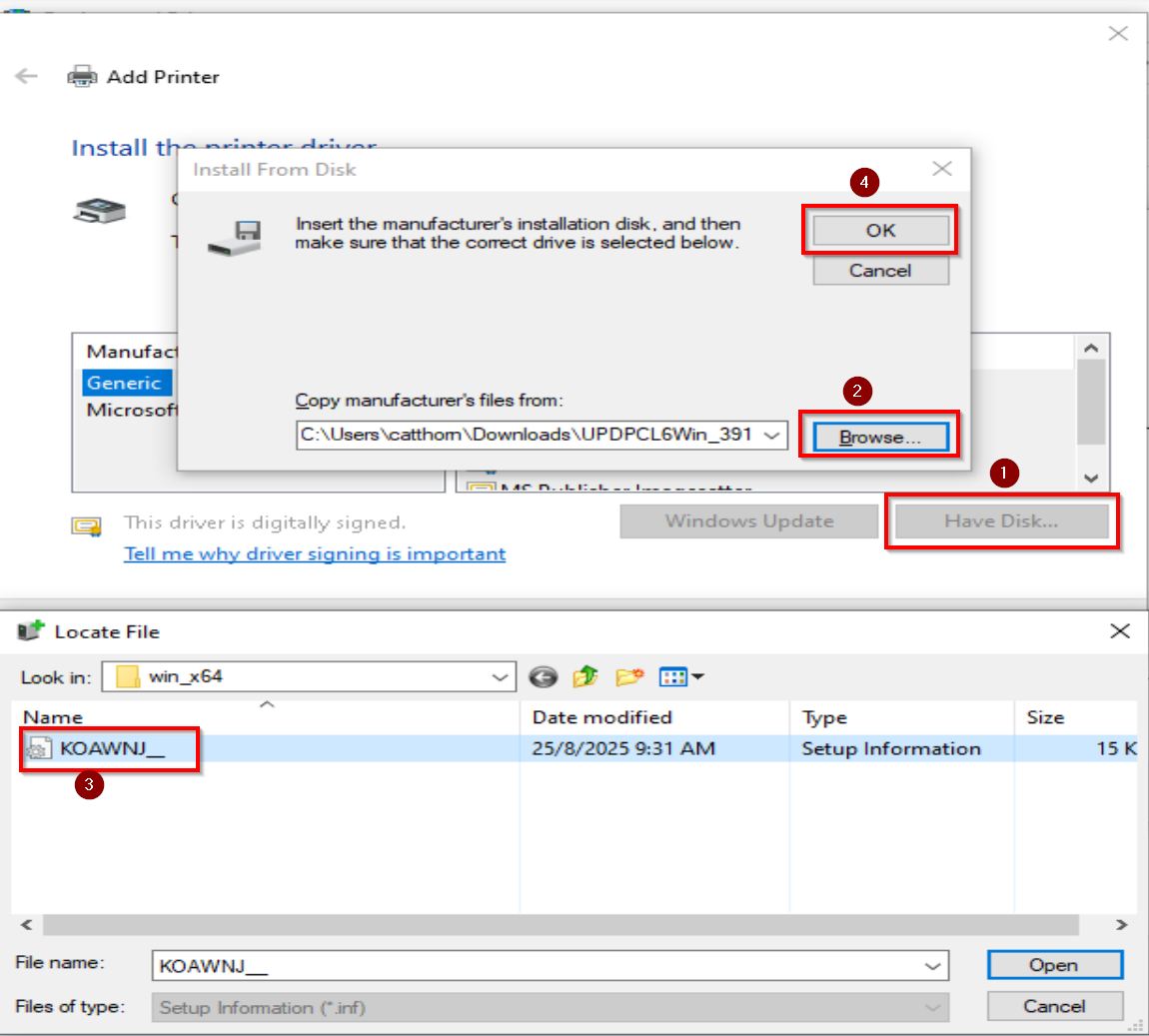 STEP 6 – Click on [Have Disk], select [Browse] and locate for the Printer Driver folder path [UPDPCL6Win_XXXXXXMU] – [driver] – [win_x64.inf]file that extracted previously.