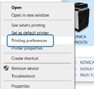 STEP 2– Right click on the Konica Minolta printer and select Printing Preferences.