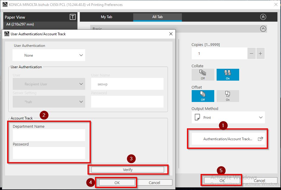 STEP 3 – Proceed to go to [All Tab] – [Basic] – [Authentication/Account Track] to key in Account Track password, click verify and proceed to select [OK] twice.