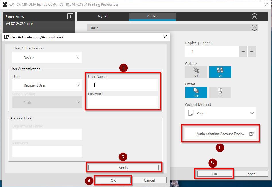 STEP 3 – Proceed to go to [All Tab] – [Basic] – [Authentication/Account Track], proceed to key in User Authentication, click verify and proceed to select [OK] twice.