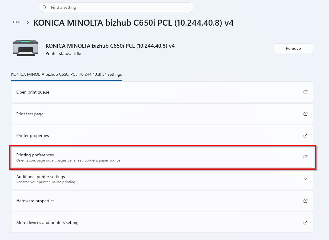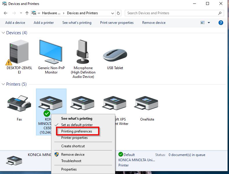 STEP 2– Right click on the Universal Konica Minolta V4 printer and select Printing Preferences. For Window 11, kindly select [Printer and scanner] – [Universal Konica Minolta V4]-[Printing preferences].